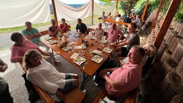 Bei allerschönstem Sommerwetter trafen wir uns Samstagnachmittag beim Weingut Edling, um die Weinberge zu erklimmen. Oben an der Hütte angekommen war bereits für uns gedeckt, die Sonnensegel aufgespannt und Meister Edling und seine Frau erwarteten uns. Alsdann wurde der erste von sieben Weinen ausgeschenkt. Wussten Sie, dass im kleinen Roßdörfer Weinberg unterschiedlichste Bodenarten vorkommen, wie Sandstein, Lösslehm, Basalt und Granit? Oder dass manche Weinreben 70 Meter tief wurzeln können? Der Nachmittag ging in den Abend über, eine köstliche Brotzeit wurde gereicht, die Stimmung wurde immer fröhlicher… Sehr zu empfehlen!